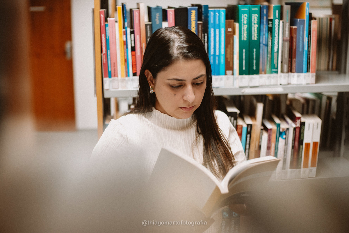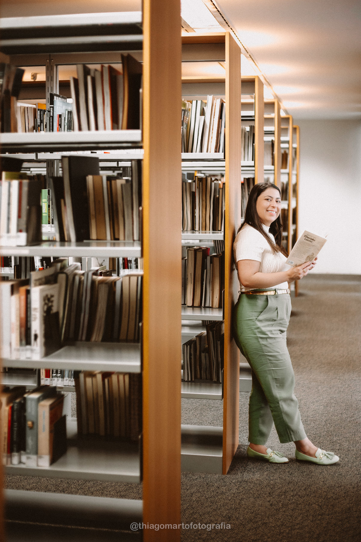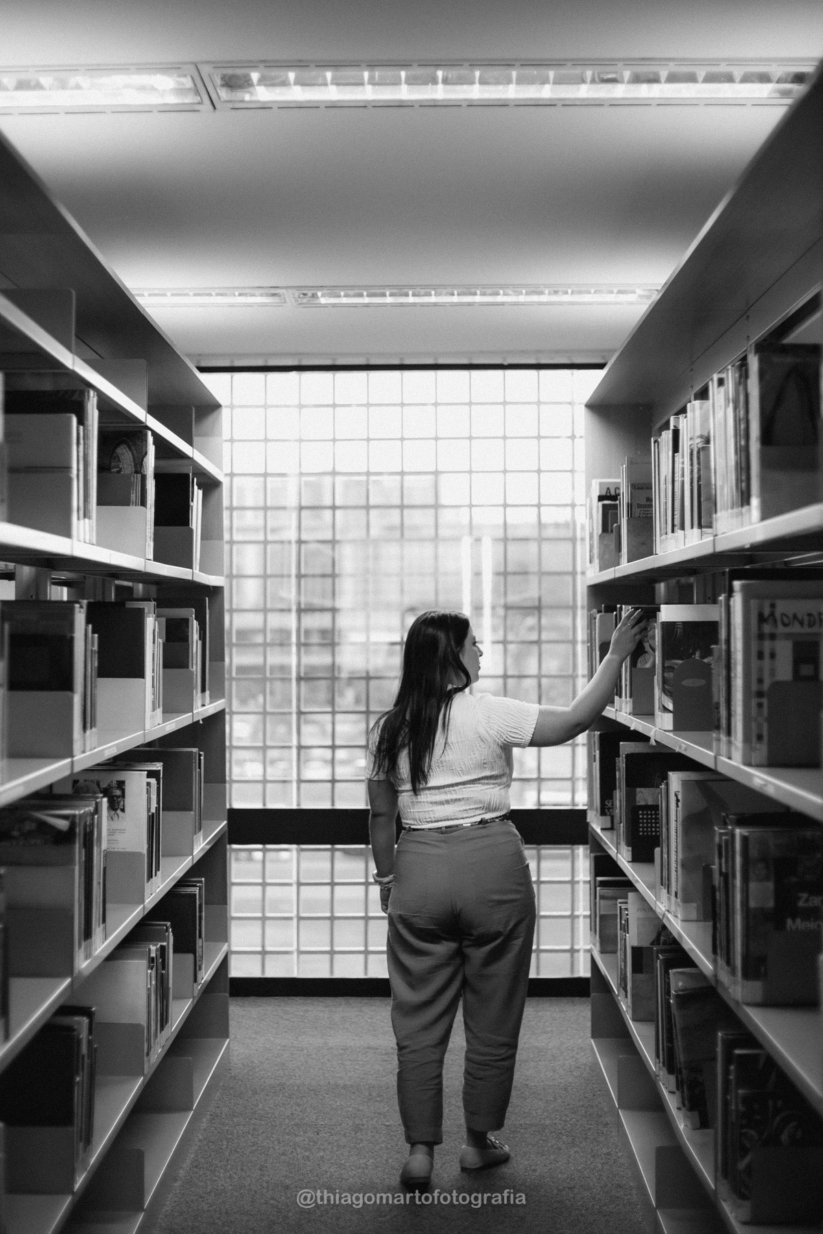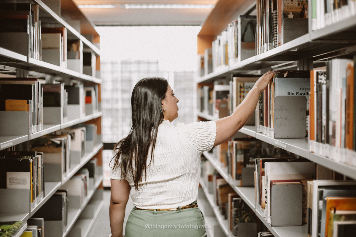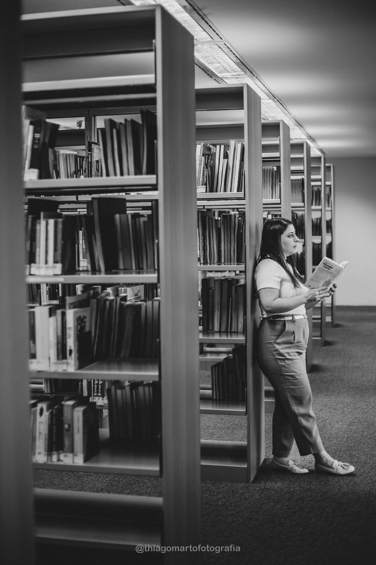Um mini ensaio fotográfico com minha esposa, entre corredores e livros da Biblioteca Nacional de Brasília.