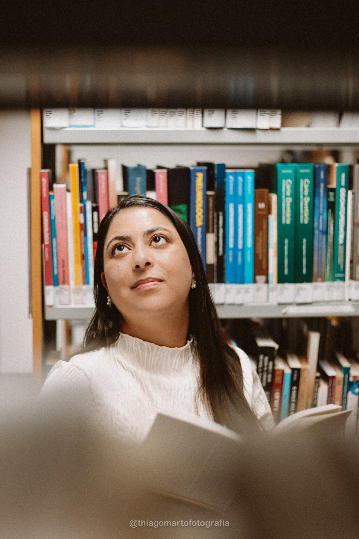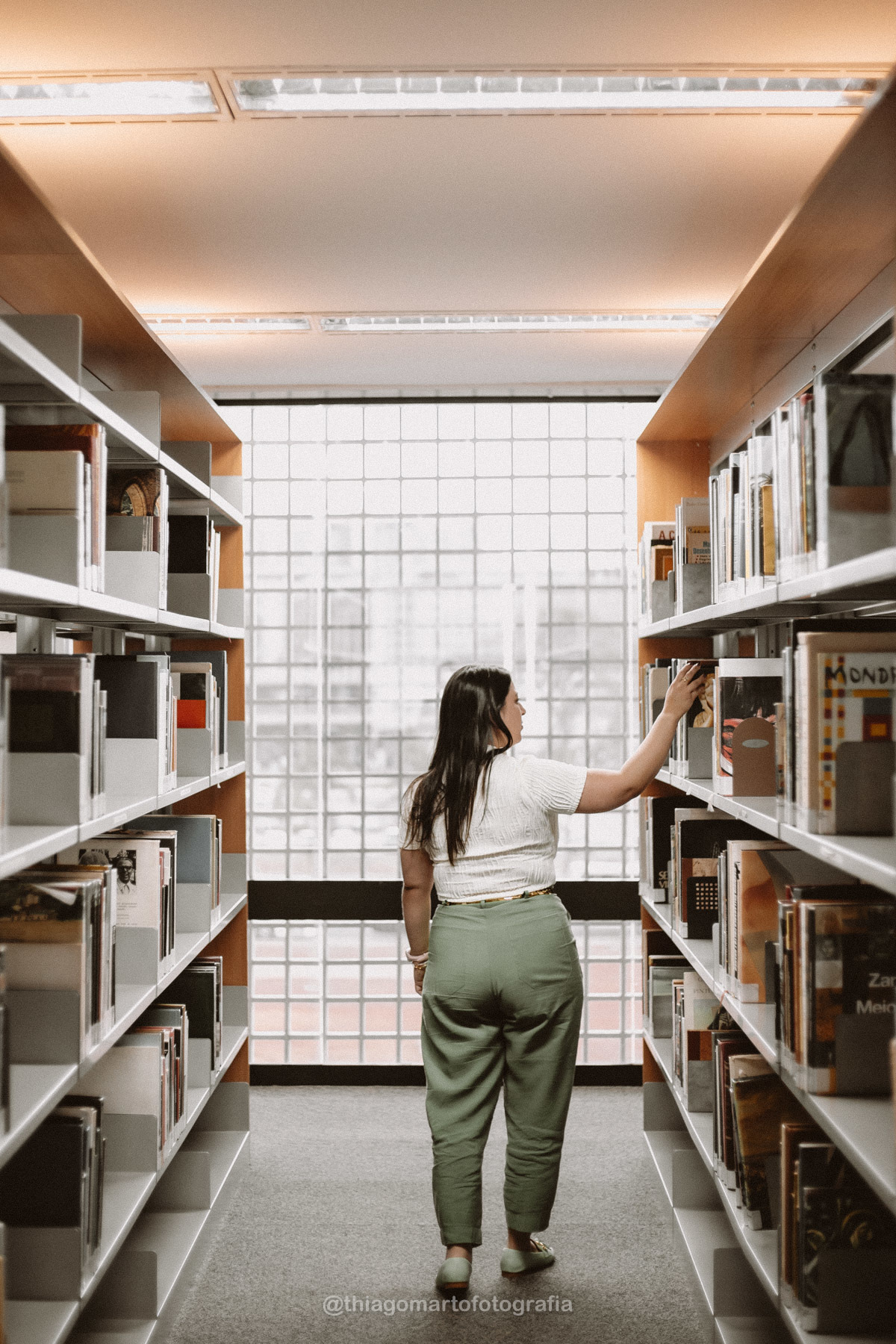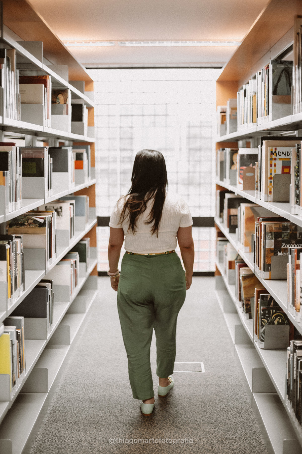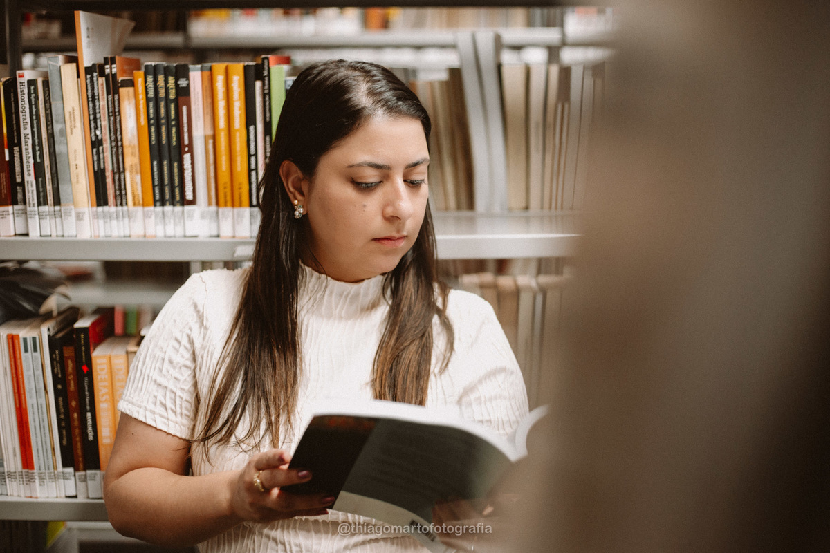 Um mini ensaio fotográfico com minha esposa, entre corredores e livros da Biblioteca Nacional de Brasília.