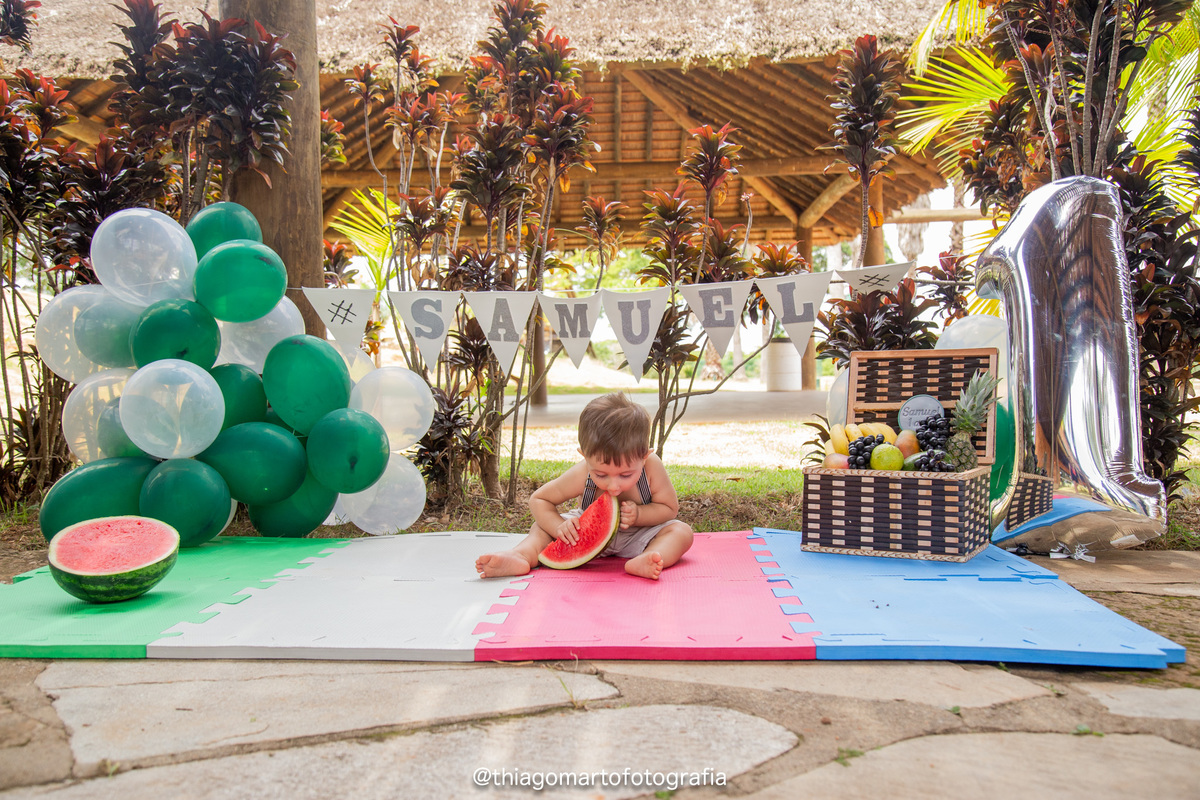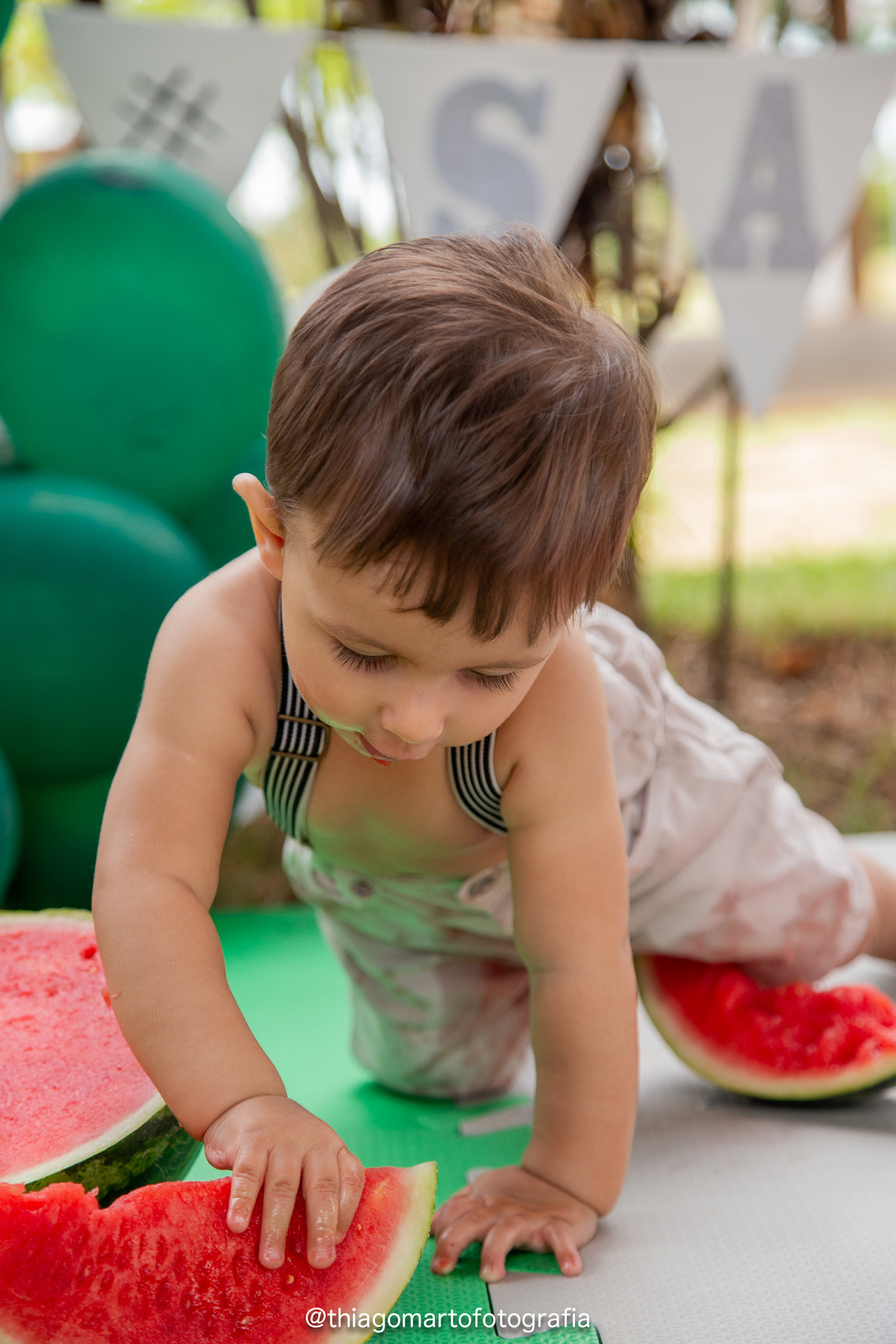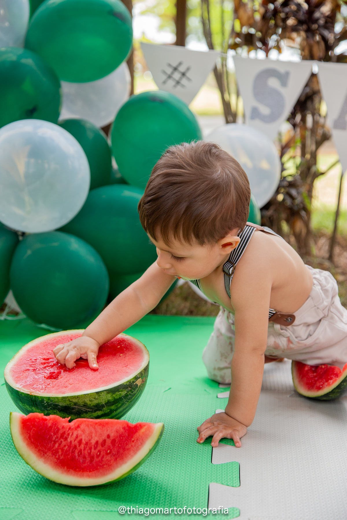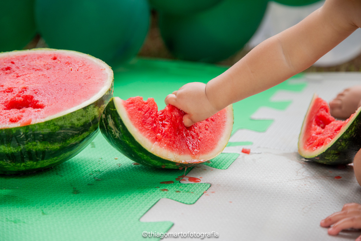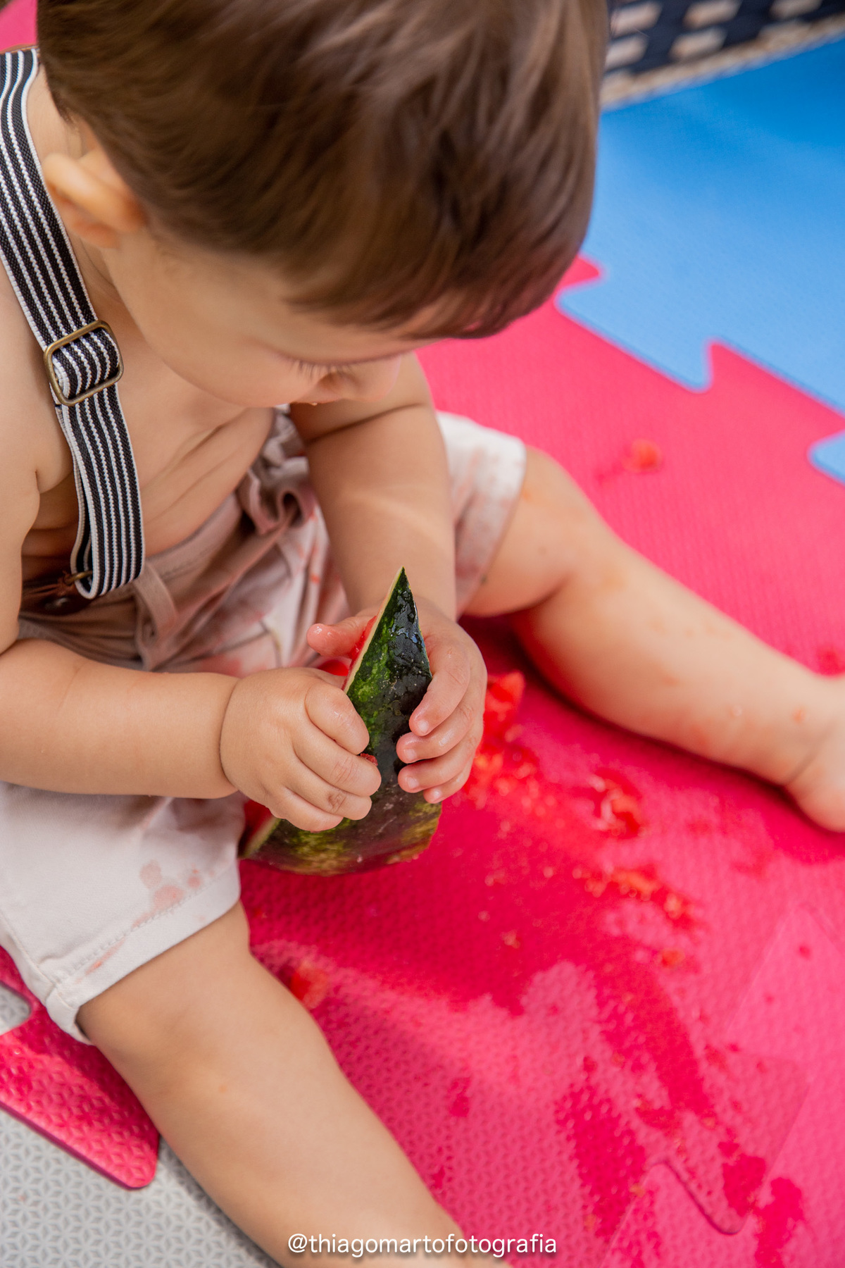 Alguns clientes gostam apenas das fotos em família; outros, me pedem pra incluir o bolo para o Smash the Cake. Eles optaram pelo mais saudável, lindas e coloridas melancias! Ele amou, e o fotógrafo aqui, também. As fotos ficaram lindas.