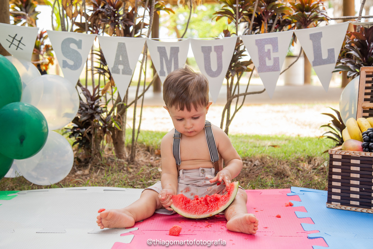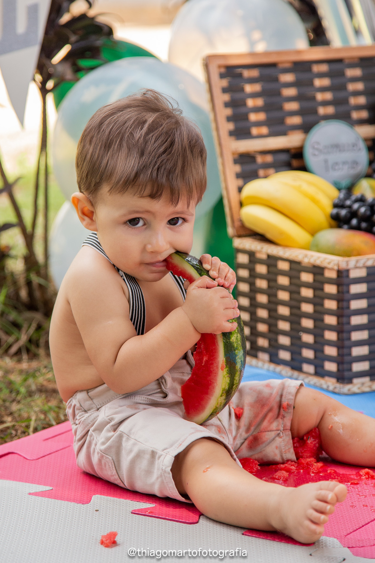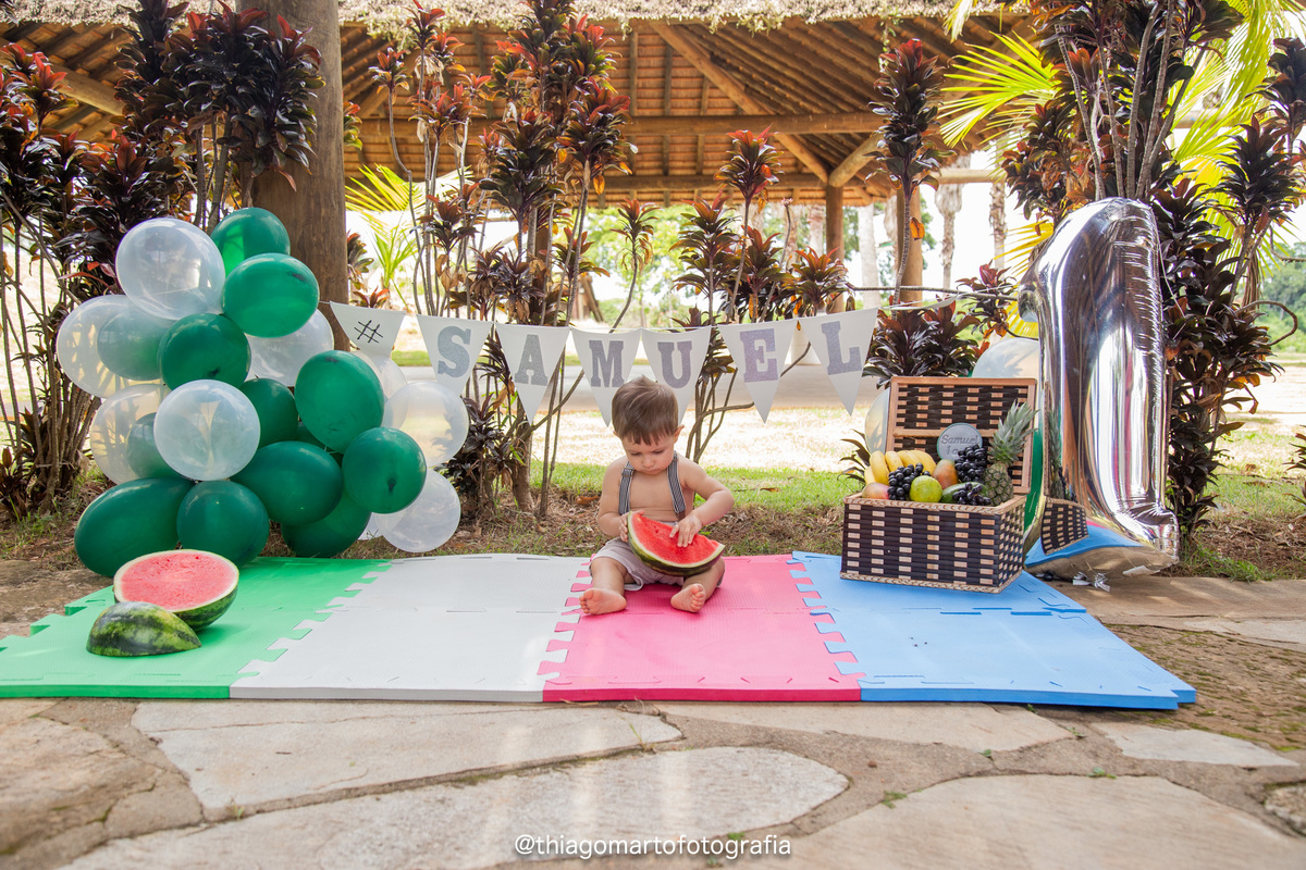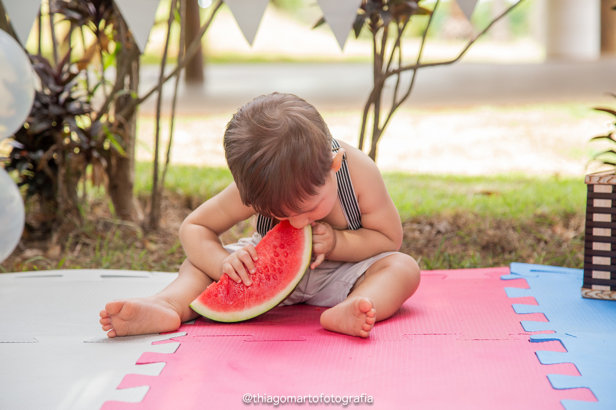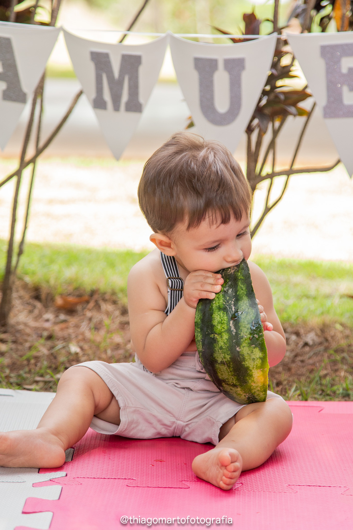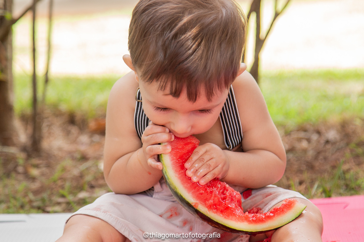 Alguns clientes gostam apenas das fotos em família; outros, me pedem pra incluir o bolo para o Smash the Cake. Eles optaram pelo mais saudável, lindas e coloridas melancias! Ele amou, e o fotógrafo aqui, também. As fotos ficaram lindas.