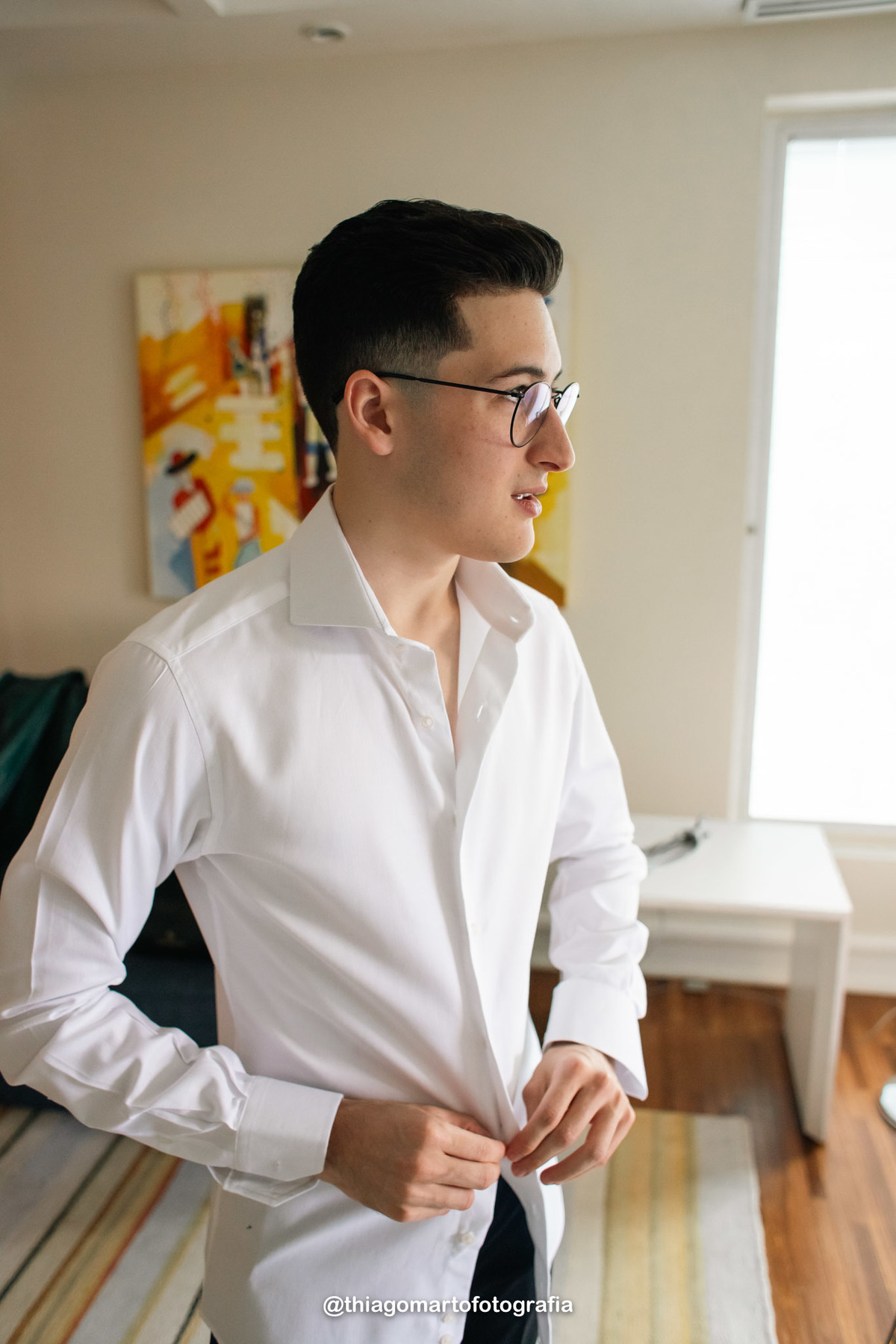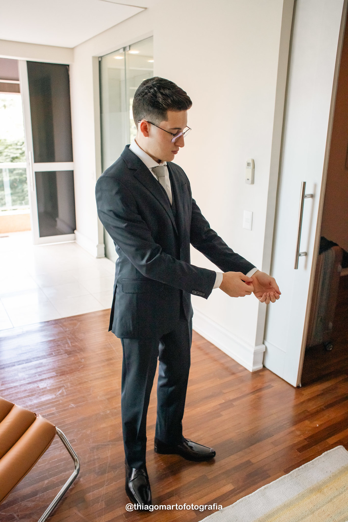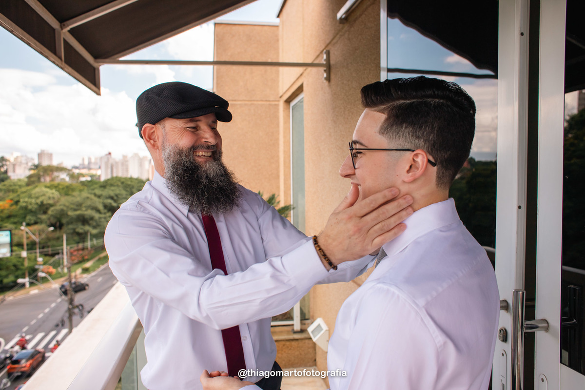 O Gabriel se arrumou para o casamento na suíte presidencial do Hotel Vitória, com seu pai e seu sogro.