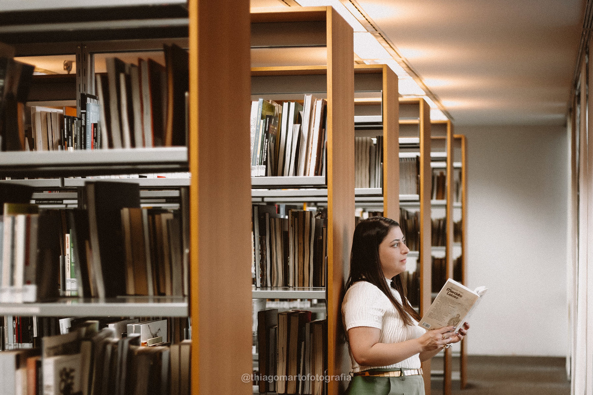 Um mini ensaio fotográfico com minha esposa, entre corredores e livros da Biblioteca Nacional de Brasília.